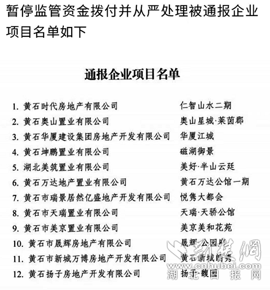 通告稱(chēng),12家被點(diǎn)名企業(yè)須及時(shí)整改,并將整改結(jié)果于9月30日前報(bào)黃石市住建局開(kāi)發(fā)辦,整改不到位的,按照信用管理規(guī)定予以減分。
