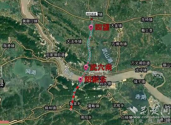 連接黃岡武穴與黃石陽新的武穴長江公路大橋,起于武穴市四望鎮(zhèn)新屋嶺,與麻陽高速對接,設(shè)武穴西樞紐互通與滬渝高速公路相連;止于陽新縣楓林鎮(zhèn),對接杭瑞高速湖北段。