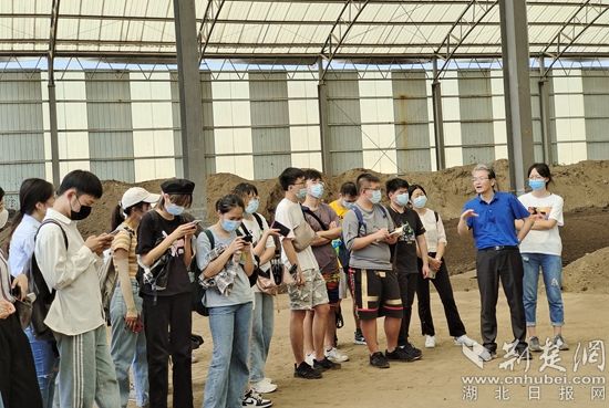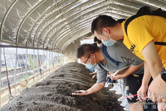 華農(nóng)師生在生態(tài)治理蚯蚓大棚現(xiàn)場(chǎng)交流蚯蚓養(yǎng)殖相關(guān)技術(shù)。通訊員供圖