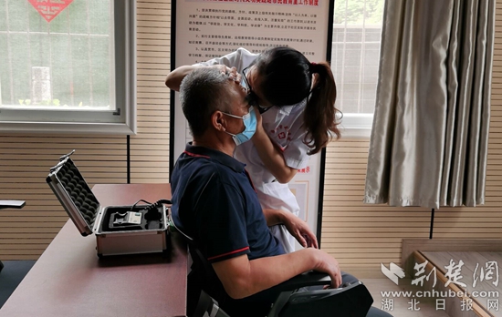 隨后,醫(yī)務人員給大家免費測量血壓、血糖、疫情常態(tài)化防控方面知識、慢病健康知識咨詢等。余臘梅還為社區(qū)的居民們提供免費視力普查及驗光、眼底檢查等。