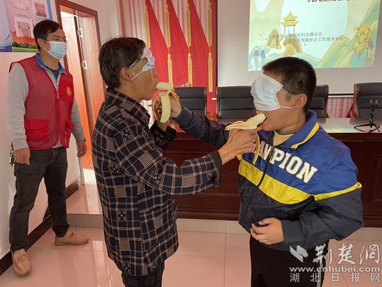 互動游戲——爺爺奶奶和小朋友面對面“蒙眼喂香蕉”。通訊員供圖