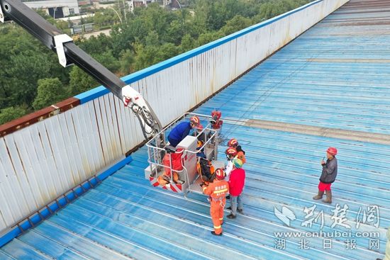 羅橋消防救援站站長立刻做出判斷,將救援人員分為三組,一組救援人員利用無人機進行空中勘察,實時匯報現(xiàn)場情況。二組救援人員攜帶簡易輕便救援工具前往屋頂,檢查現(xiàn)場屋頂情況,避免被困人員因屋頂?shù)顾盏蕉蝹?。同時,三組駕駛員立即升起68米登高平臺車,由羅橋消防救援站站長帶領(lǐng)一名醫(yī)護人員,從空中救援。經(jīng)過40余分鐘的緊急救援,被困工人被成功救出,隨后交給醫(yī)護人員送往醫(yī)院。