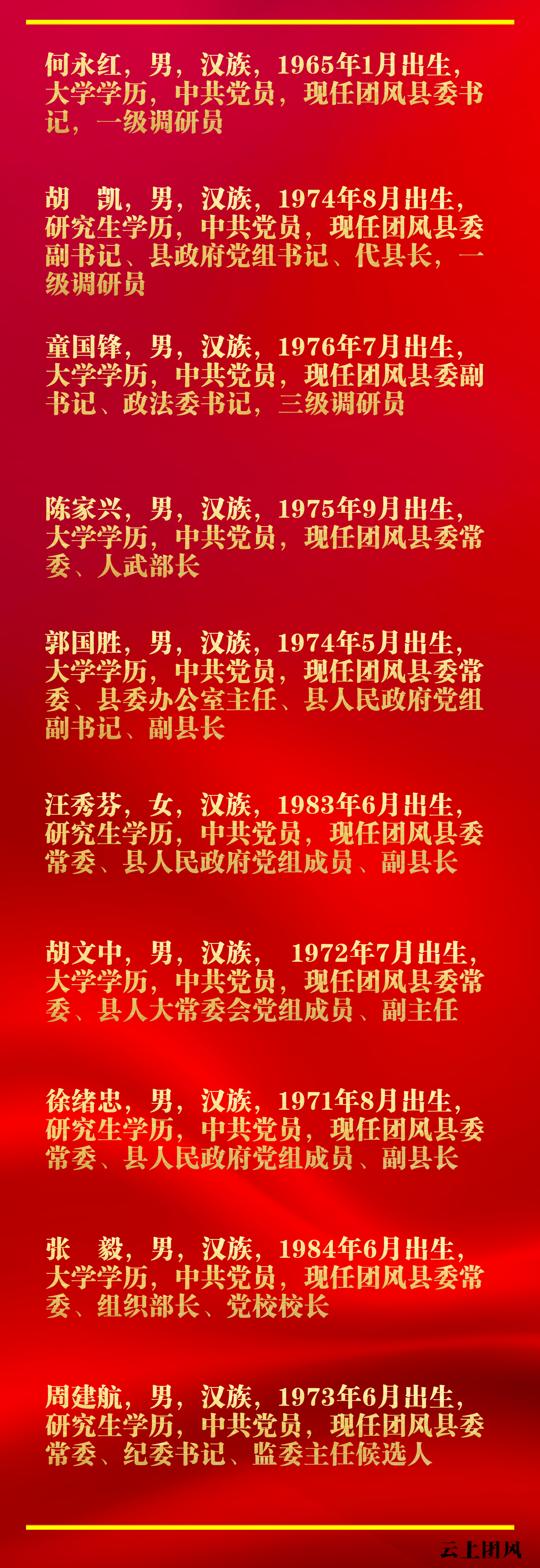 10月29日,中國共產(chǎn)黨團風(fēng)縣第六屆委員會舉行第一次全體會議。會議選舉產(chǎn)生了中國共產(chǎn)黨團風(fēng)縣第六屆委員會書記、副書記、常務(wù)委員。