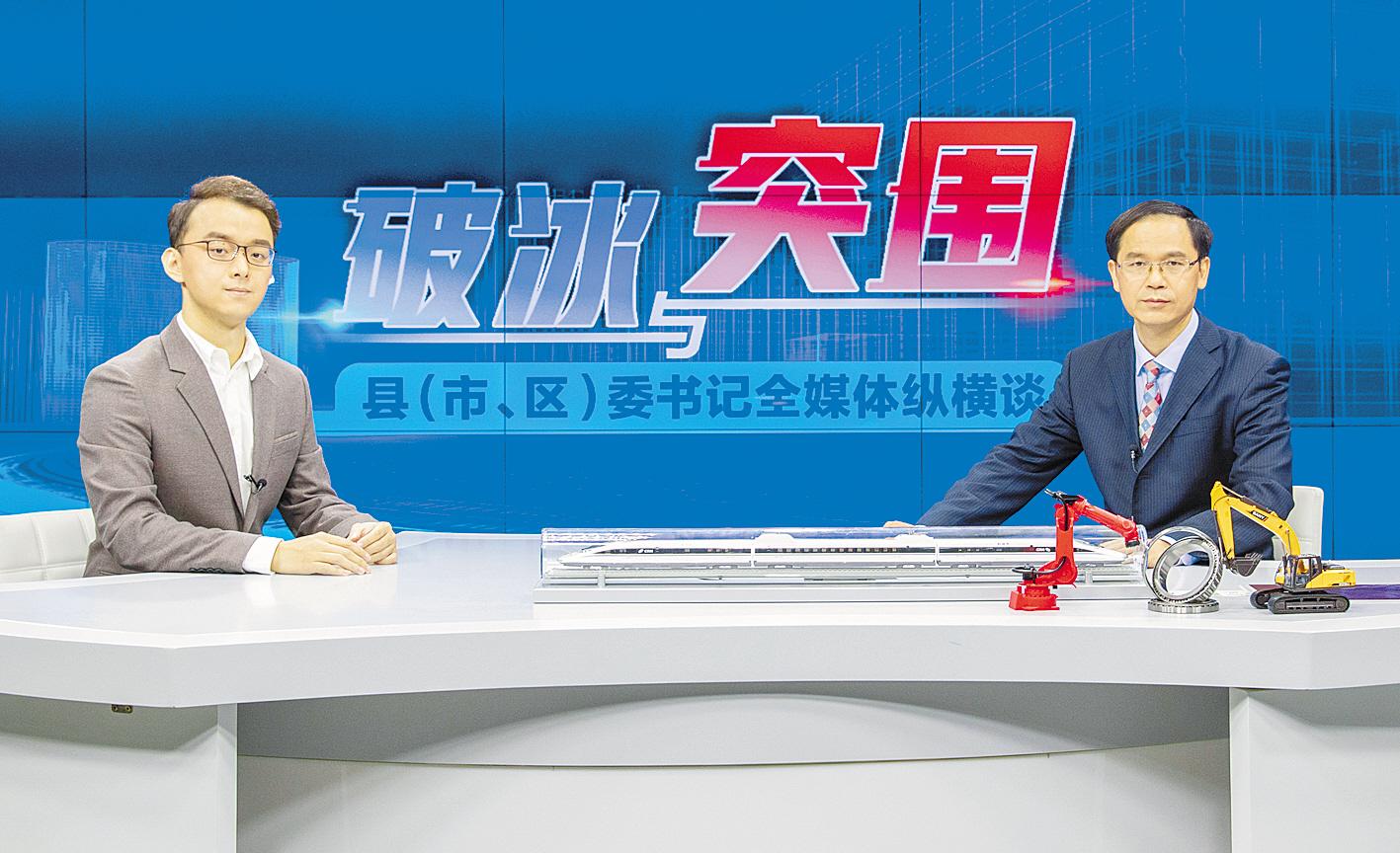 10月30日,黃石市下陸區(qū)委書記宛小林(右)做客湖北日報5G演播室。(湖北日報全媒記者 薛婷 攝)