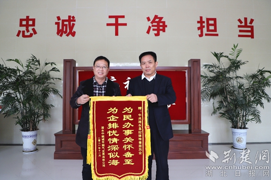 浠水中燃城市燃?xì)獍l(fā)展有限公司負(fù)責(zé)人向浠水縣紀(jì)委監(jiān)委送來錦旗。通訊員供圖