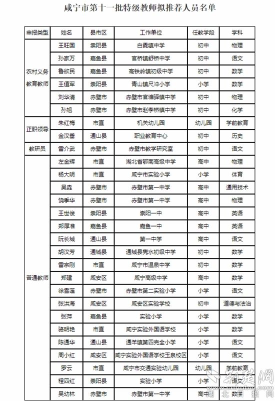 咸寧市第十一批特級教師擬推薦人員名單。來源:咸寧市教育局