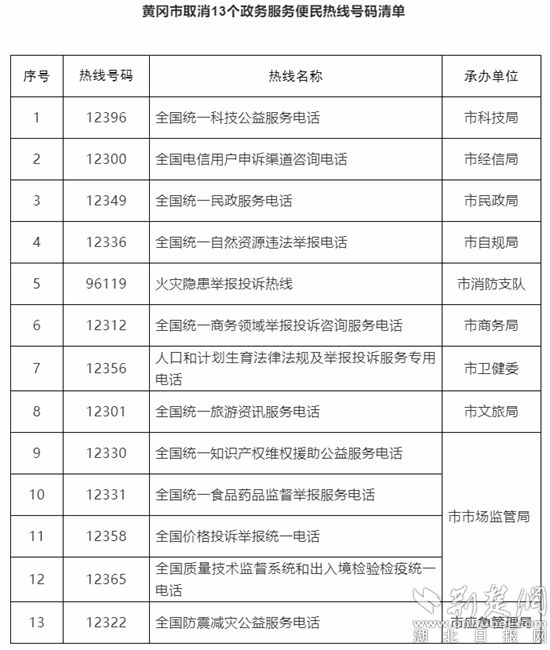 黃岡市取消13個(gè)政務(wù)服務(wù)便民熱線號(hào)碼清單。來源:黃岡政府網(wǎng)