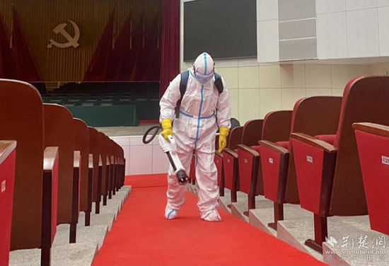 市疾控工作人員在黨代會(huì)會(huì)議現(xiàn)場(chǎng)進(jìn)行消毒消殺。通訊員 供圖