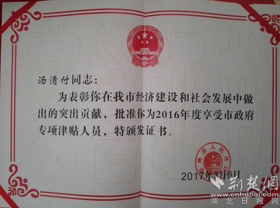 據(jù)悉,湯清付已多次被鄂城區(qū)委、區(qū)政府,沙窩鄉(xiāng)保團村黨支部授予優(yōu)秀共產(chǎn)黨員榮譽稱號;被鄂州市農(nóng)委、鄂城區(qū)農(nóng)業(yè)局授予農(nóng)業(yè)系統(tǒng)先進(jìn)個人榮譽稱號。