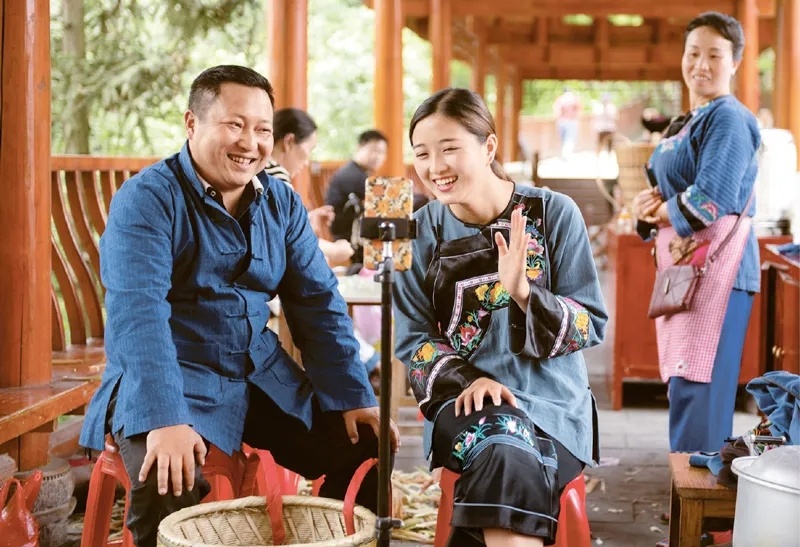 圖為2020年5月15日,湖南省十八洞村第三任駐村扶貧工作隊(duì)隊(duì)長麻輝煌(左)與返鄉(xiāng)大學(xué)生施林嬌一起通過網(wǎng)絡(luò)直播推銷土特產(chǎn)。新華社發(fā) 陳思汗/攝