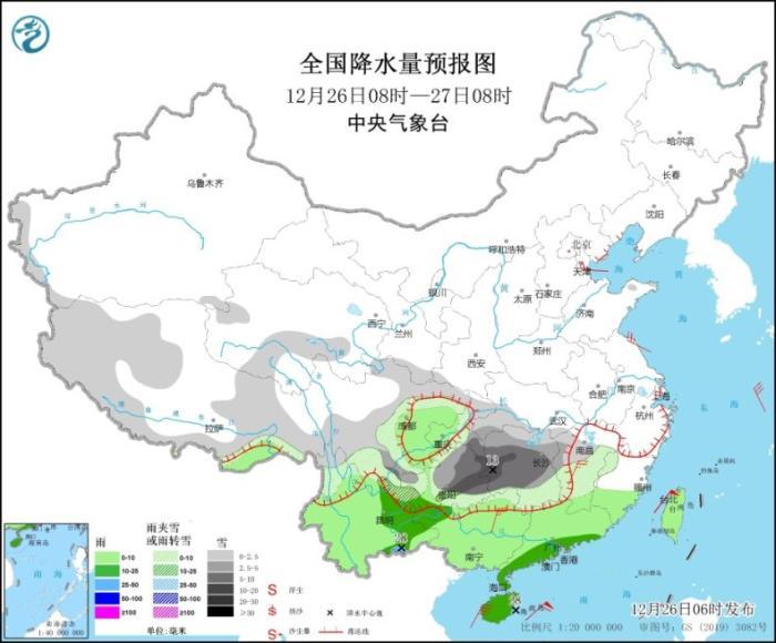 12月26日8時(shí)至27日8時(shí),新疆南疆西部山區(qū)、西藏西部、南部和東部、青海南部、西南地區(qū)東部、江漢南部、江南北部和西部等地部分地區(qū)有小到中雪,其中,湖南中西部、重慶東南部、貴州中東部等地部分地區(qū)有大雪,湖南西部、貴州中東部等地部分地區(qū)有暴雪(10~13毫米)。江南南部、西南地區(qū)東部和南部、華南、臺(tái)灣島等地部分地區(qū)有小到中雨,局地有大雨(25~28毫米)。廣西東北部部分地區(qū)有4~5級(jí)風(fēng)。