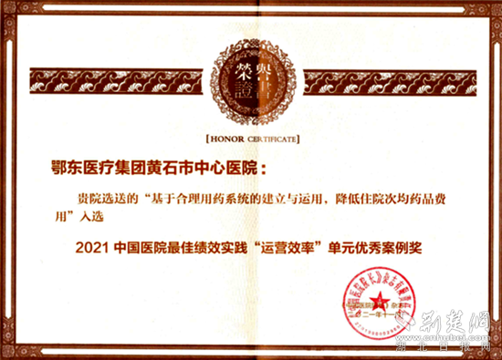荊楚網(wǎng)(湖北日?qǐng)?bào)網(wǎng))訊(通訊員 石紅兵)近日,2021年第二屆全國(guó)績(jī)效大會(huì)標(biāo)桿管理案例評(píng)選結(jié)果揭曉,黃石市中心醫(yī)院參選的“信息化與國(guó)際指南相結(jié)合的單病種質(zhì)量管理模式”、“基于合理用藥系統(tǒng)的建立與運(yùn)用,降低住院次均藥品費(fèi)用”兩個(gè)案例,經(jīng)過(guò)嚴(yán)格遴選和評(píng)審,最終榮獲2021中國(guó)醫(yī)院最佳績(jī)效實(shí)踐“醫(yī)療質(zhì)量”優(yōu)秀獎(jiǎng)和“運(yùn)營(yíng)效率”優(yōu)秀獎(jiǎng)。