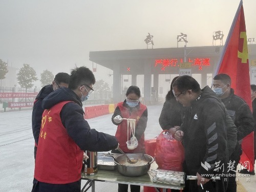在武穴西收費(fèi)站,收費(fèi)員配合協(xié)助地方做好疫情防控工作的同時,為往來司乘送上一碗碗熱騰騰的面條。( 通訊員黃利文、吳輝、張溪)