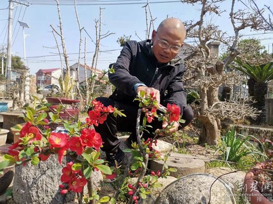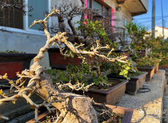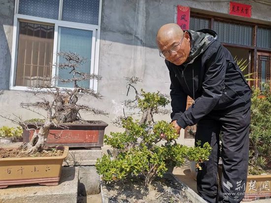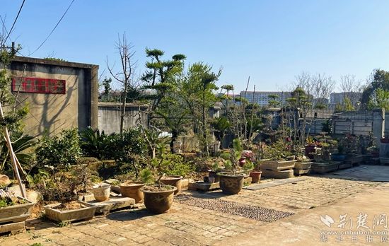 3月12日,記者在鄂州市華容區(qū)“最美家庭”得主——劉雙全的院內(nèi)見到,數(shù)十種盆景依路排開。