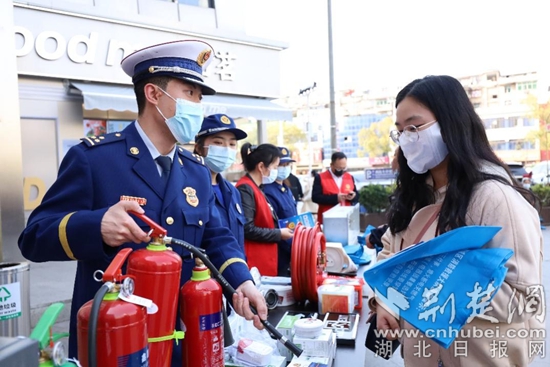 消防員向過往群眾科普如何鑒別假冒偽劣消防產(chǎn)品。通訊員供圖