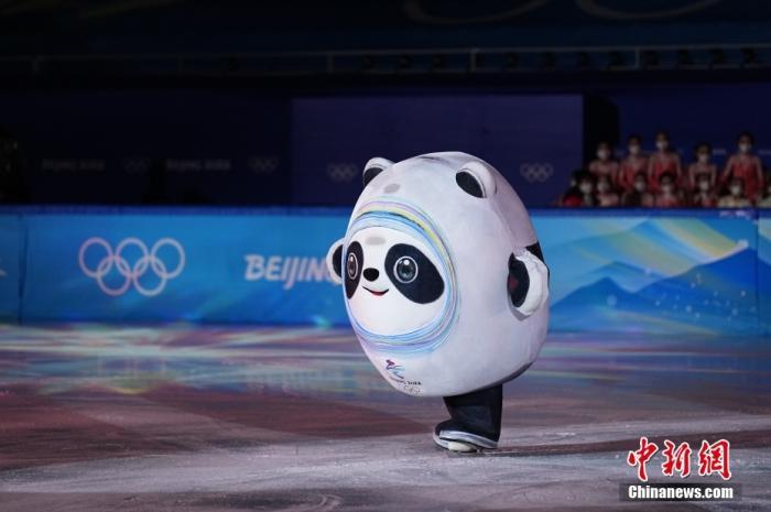 2月20日,北京2022年冬奧會花樣滑冰表演滑在首都體育館舉行。圖為“冰墩墩”亮相表演滑。 中新社記者 崔楠 攝