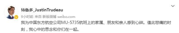加拿大總理特魯多22日通過其官方微博賬號(hào)發(fā)文說,為中國東方航空公司MU5735航班乘機(jī)者的家屬、朋友和親人感到心碎,“值此悲痛的時(shí)刻,我心中的思念和你們在一起。”