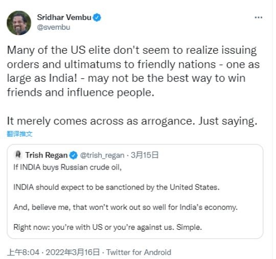 美國(guó)??怂股虡I(yè)頻道女主播翠西·里根15日也在社交媒體上發(fā)文稱(chēng),“如果印度購(gòu)買(mǎi)俄羅斯原油,應(yīng)該受到美國(guó)制裁。這對(duì)印度經(jīng)濟(jì)來(lái)說(shuō)不是好事?,F(xiàn)在(印度面臨的選擇)是支持美國(guó)還是反對(duì)美國(guó),這很簡(jiǎn)單?!庇《雀簧?、軟件公司Zoho創(chuàng)始人斯里達(dá)爾·芬布隨后轉(zhuǎn)發(fā)該帖文寫(xiě)道,“許多美國(guó)精英似乎沒(méi)有意識(shí)到,對(duì)一個(gè)像印度這樣大的友好國(guó)家發(fā)號(hào)施令和下達(dá)最后通牒,可能不是贏得朋友和影響他人的最佳方式。只能給人傲慢的印象。”