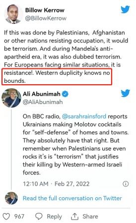 一位記者指出,英國(guó)廣播公司(BBC)對(duì)烏克蘭人制作燃燒瓶對(duì)付俄羅斯軍人的行為大加贊揚(yáng),但當(dāng)巴勒斯坦人因?yàn)橄蜓b備全副西式武裝的士兵扔石子被殺時(shí),西方卻稱(chēng)巴勒斯坦人為“恐怖分子”。一位肯尼亞政治家說(shuō)得更直接:“西方雙標(biāo)起來(lái)沒(méi)有底線?!?/p>