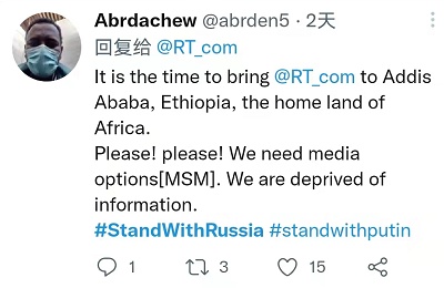 一位受不了西方媒體虛偽和雙標(biāo)說(shuō)辭的埃塞網(wǎng)友呼吁俄羅斯媒體增強(qiáng)在非洲的存在,因?yàn)槲鞣矫襟w“剝奪”了他們的信息獲取。