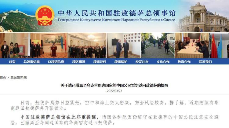 中國駐敖德薩總領(lǐng)館在此鄭重提醒,請因各種原因仍留守在敖德薩的中國公民注意安全避險,已撤離至烏周邊國家的華商暫勿返回敖德薩。