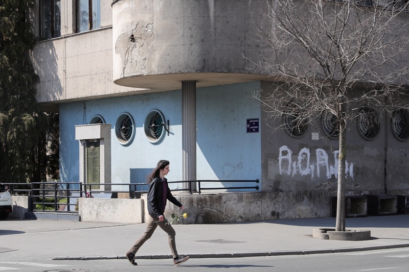 ↑2022年3月21日,在塞爾維亞貝爾格萊德,手持一束花的行人經(jīng)過曾經(jīng)遭受北約空襲的南斯拉夫空軍司令部大廈。新華社記者 鄭煥松 攝