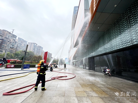 消防救援人員首先利用移動搖擺炮對外部火勢進行控制,后出動水槍對明火進行壓制。與此同時,指揮員安排一組人員進入建筑內(nèi)部疏散救援受傷人員。數(shù)十分鐘后,火情得到有效控制,商場內(nèi)員工、顧客全部疏散到安全區(qū)域,演習(xí)結(jié)束。