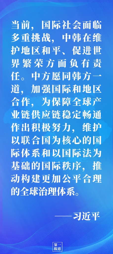 習(xí)近平強調(diào),當(dāng)前,國際社會面臨多重挑戰(zhàn),中韓在維護地區(qū)和平、促進世界繁榮方面負(fù)有責(zé)任。中方愿同韓方一道,加強國際和地區(qū)合作,為保障全球產(chǎn)業(yè)鏈供應(yīng)鏈穩(wěn)定暢通作出積極努力,維護以聯(lián)合國為核心的國際體系和以國際法為基礎(chǔ)的國際秩序,推動構(gòu)建更加公平合理的全球治理體系。