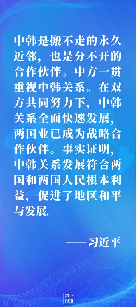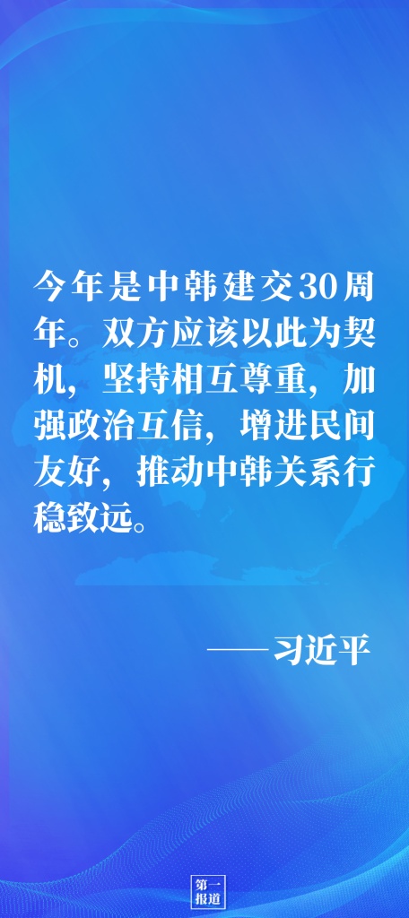 習(xí)近平指出,中韓是搬不走的永久近鄰,也是分不開的合作伙伴。中方一貫重視中韓關(guān)系。在雙方共同努力下,中韓關(guān)系全面快速發(fā)展,兩國業(yè)已成為戰(zhàn)略合作伙伴。事實證明,中韓關(guān)系發(fā)展符合兩國和兩國人民根本利益,促進了地區(qū)和平與發(fā)展。今年是中韓建交30周年。雙方應(yīng)該以此為契機,堅持相互尊重,加強政治互信,增進民間友好,推動中韓關(guān)系行穩(wěn)致遠。
