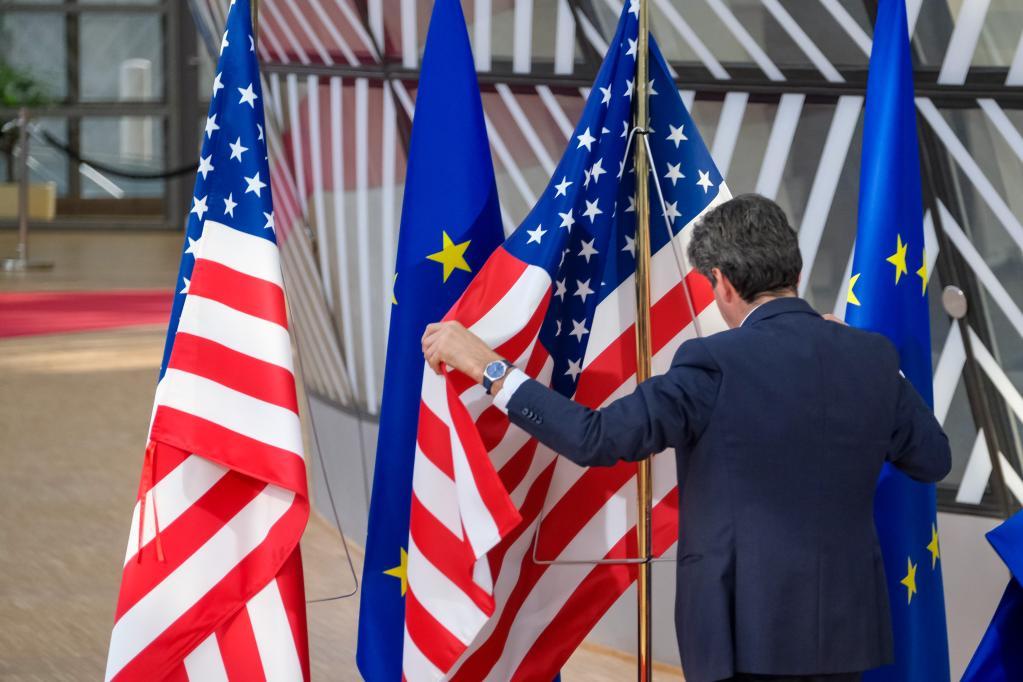 3月24日,工作人員在比利時布魯塞爾的歐盟總部整理美國國旗。新華社記者張鋮攝