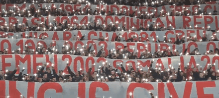 ▲2022年3月17日,在塞爾維亞首都貝爾格萊德舉行的一場歐聯(lián)杯比賽中,現(xiàn)場觀眾拉起多條橫幅,細數(shù)美國、北約過去幾十年來轟炸或挑起戰(zhàn)爭的國家和地區(qū)名單,并高唱反戰(zhàn)歌曲,以此諷刺西方在“反戰(zhàn)”方面的雙重標(biāo)準(zhǔn)。