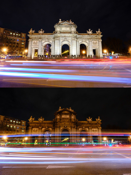 這張拼版照片顯示的是,3月26日,位于西班牙馬德里的阿爾卡拉門在“地球一小時”開始前(上)后的景象(長時間曝光照片)。新華社記者孟鼎博攝