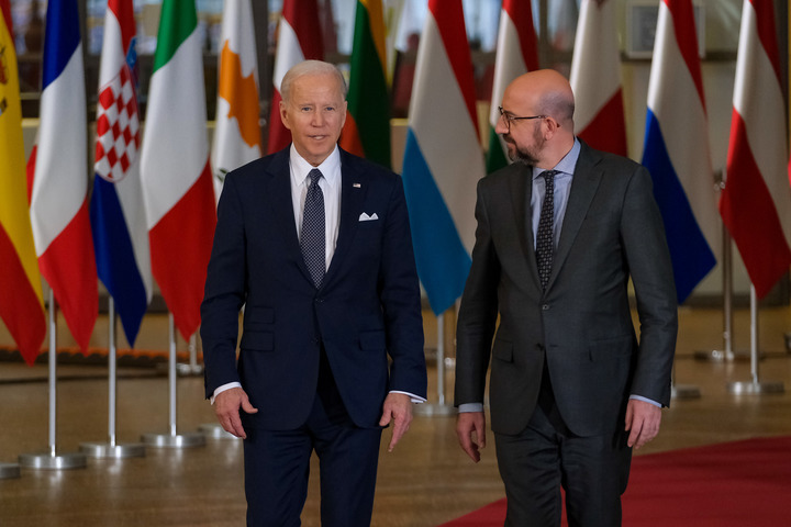 3月24日,美國總統(tǒng)拜登(左)和歐洲理事會主席米歇爾抵達(dá)歐盟總部。新華社記者張鋮攝