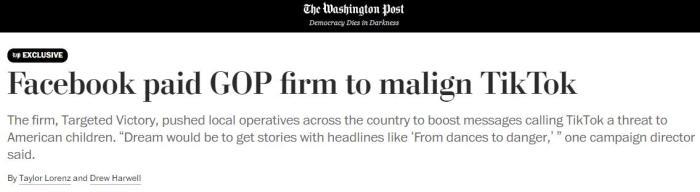 《華盛頓郵報》指出,Targeted Victory公司運用多種手段對TikTok進行打壓,包括在美國各地主要新聞媒體發(fā)表專欄文章以及讀者來信,宣傳源自于Facebook的真實性存疑的文章,以及試圖吸引政治記者和地方政客幫助打壓其最大的競爭對手。