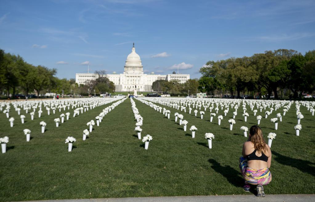 2021年4月13日,一名女子觀看美國(guó)華盛頓國(guó)家廣場(chǎng)草坪上擺放的白色絹花。新華社記者 劉杰 攝
