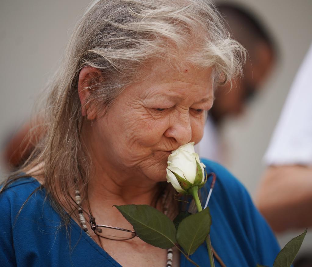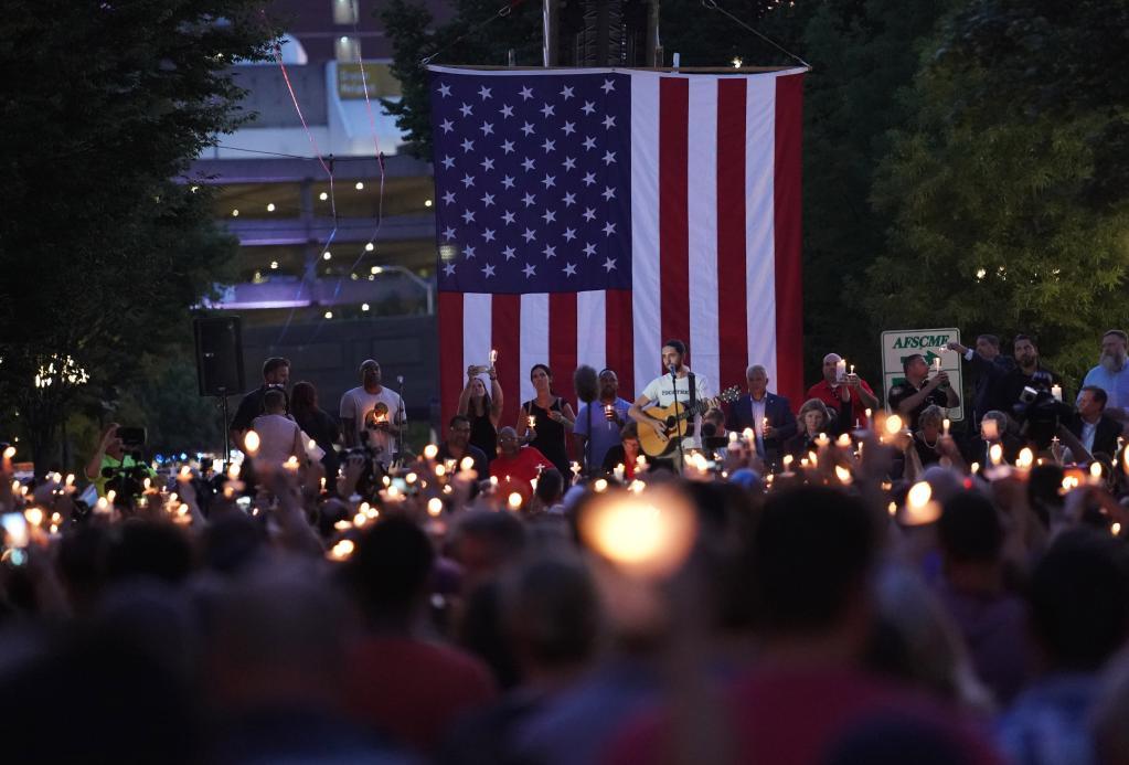 2019年8月4日,在美國(guó)俄亥俄州代頓市,人們?yōu)闃寭羰录鲭y者舉行悼念活動(dòng)。美國(guó)俄亥俄州代頓市8月4日凌晨發(fā)生一起槍擊事件,造成包括槍手在內(nèi)的至少10人死亡。新華社記者 劉杰 攝