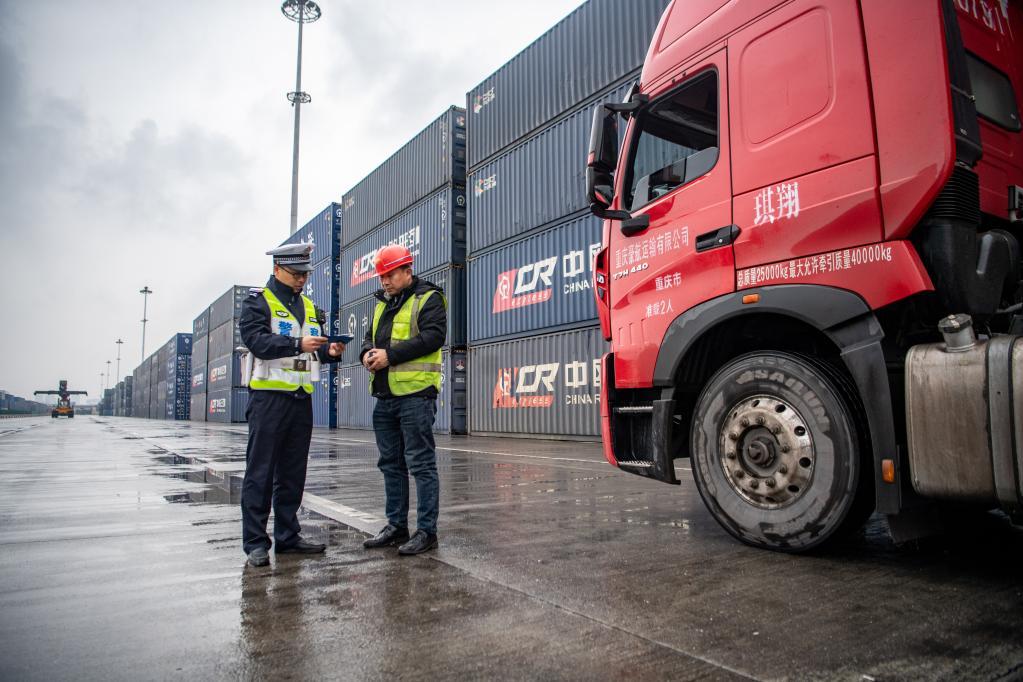 2022年1月25日,中歐班列起點聯(lián)合巡邏隊成員(左)在重慶團結(jié)村中心站貨場對貨車司機進行例行安全檢查。新華社記者 唐奕 攝