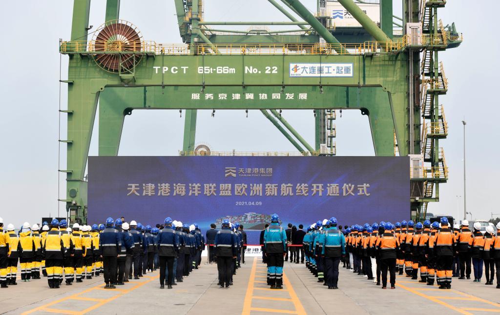 2021年4月9日拍攝的天津港海洋聯(lián)盟歐洲新航線開通儀式現(xiàn)場。新華社記者 趙子碩 攝