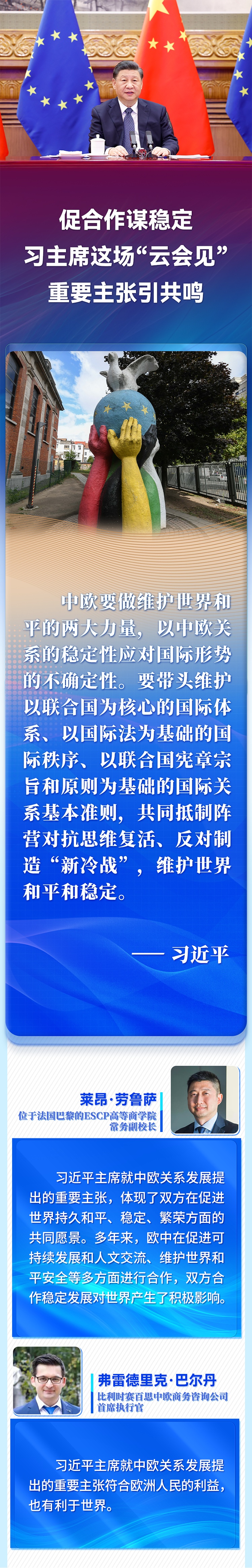 國家主席習近平4月1日晚在北京以視頻方式會見歐洲理事會主席米歇爾和歐盟委員會主席馮德萊恩。歐洲多國人士高度評價習近平主席就中歐關(guān)系、烏克蘭危機等問題提出的重要主張,認為會晤為雙方關(guān)系持續(xù)健康發(fā)展作出戰(zhàn)略引領(lǐng),為復雜動蕩的國際局勢注入穩(wěn)定性。
