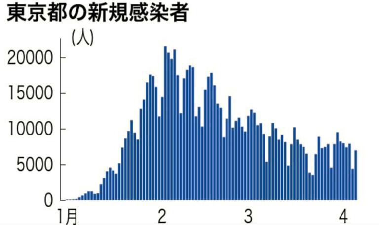 4月7日,東京都新增確診病例8753例,與上周四相比增加了527例。截至4月7日,東京都最近一周的日均新增確診病例數為7433.3例,是前一周的98.7%。