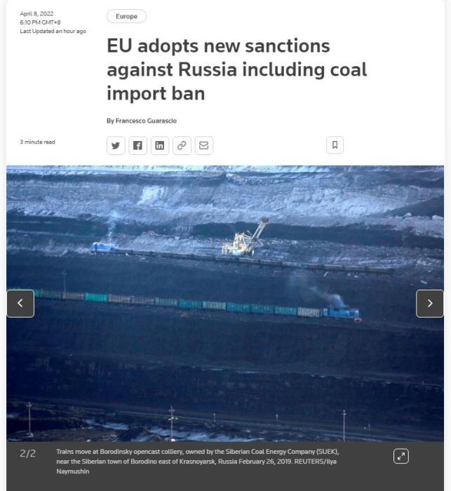 中新網(wǎng)4月8日電 綜合外媒報道,當?shù)貢r間8日,歐盟正式通過了對俄羅斯的第五輪制裁方案,其中最重磅的當屬禁止從俄進口煤炭。不過,考慮到成員國需要時間尋找替代供應源,煤炭禁令將設120天的過渡期,直至8月才會生效。