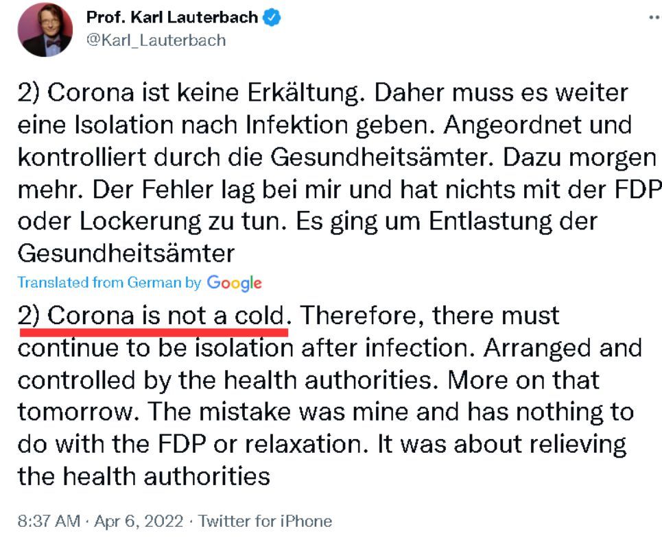 勞特巴赫甚至還在自己的社交賬號上公開道歉,稱自己“犯了一個錯誤”。他說,雖然取消陽性病例的強制隔離措施可以減輕德國各地衛(wèi)生部門的負擔,但此舉卻發(fā)出了一個“錯誤和有害”的信號,因為“新冠不是感冒”。