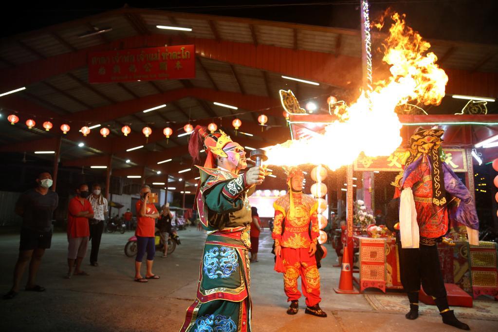 在泰國(guó)那空沙旺府,一名潮劇演員在表演噴火。新華社記者王騰攝