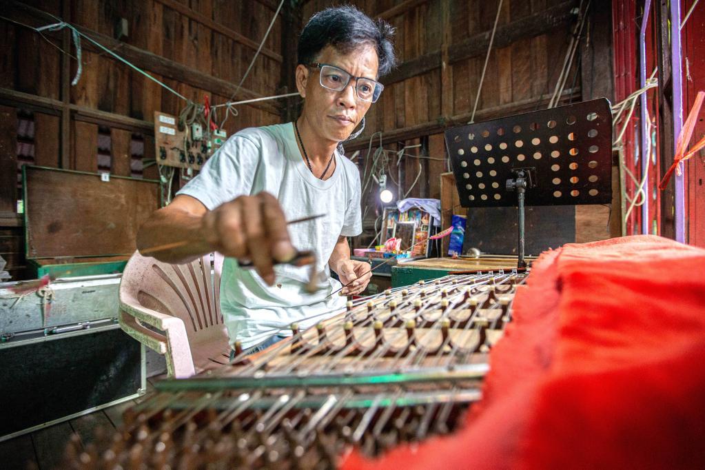 在泰國(guó)那空沙旺府,一名潮劇團(tuán)樂師在演奏樂器。新華社記者王騰攝