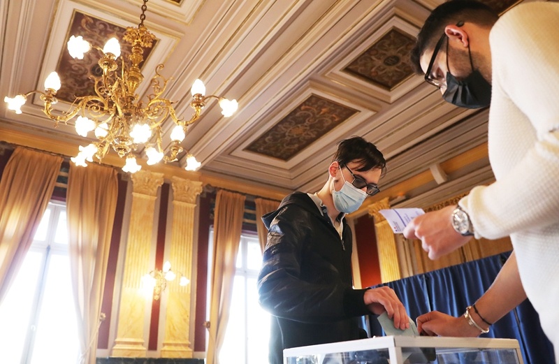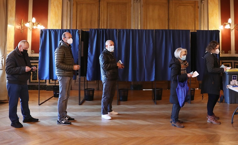↑4月10日,選民在法國巴黎郊區(qū)的克里希市一家投票站投票。新華社記者 高靜 攝