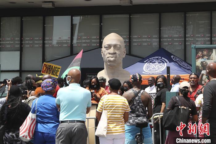 當(dāng)?shù)貢r(shí)間2021年6月25日,美國紐約民眾在布魯克林區(qū)新落成的弗洛伊德塑像前舉行集會(huì)。 中新社記者 廖攀 攝