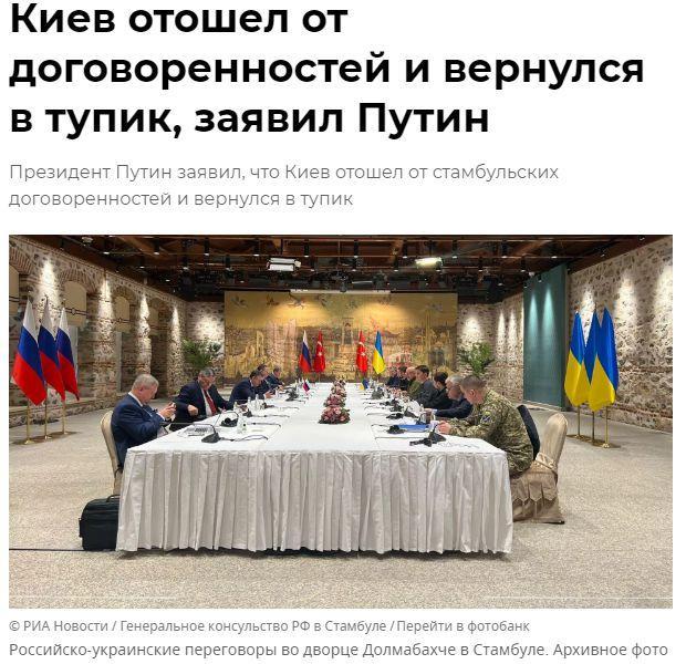 普京當(dāng)日在新聞發(fā)布會上表示,俄烏談判因?yàn)醴健捌健毕萑虢┚帧Kf,烏克蘭偏離此前談判達(dá)成的共識,談判由此進(jìn)入“死胡同”。