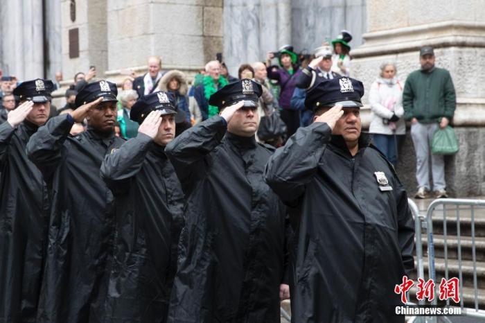 資料圖:當(dāng)?shù)貢r(shí)間3月17日,紐約圣帕特里克節(jié)游行活動中的警察參加向新冠逝者默哀儀式。 中新社記者 廖攀 攝
