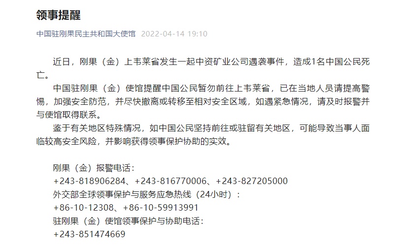 當(dāng)?shù)貢r(shí)間14日,中國駐剛果(金)使館發(fā)布領(lǐng)事提醒稱,近日,剛果(金)上韋萊省發(fā)生一起中資礦業(yè)公司遇襲事件,造成1名中國公民死亡。