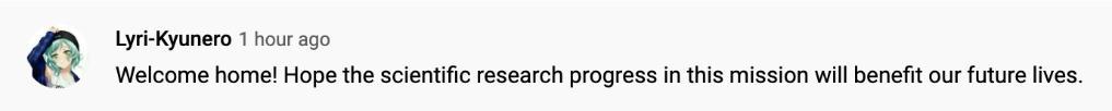 “歡迎回家!希望此次任務(wù)中的科研進(jìn)展可以造福我們的未來?!?/p>